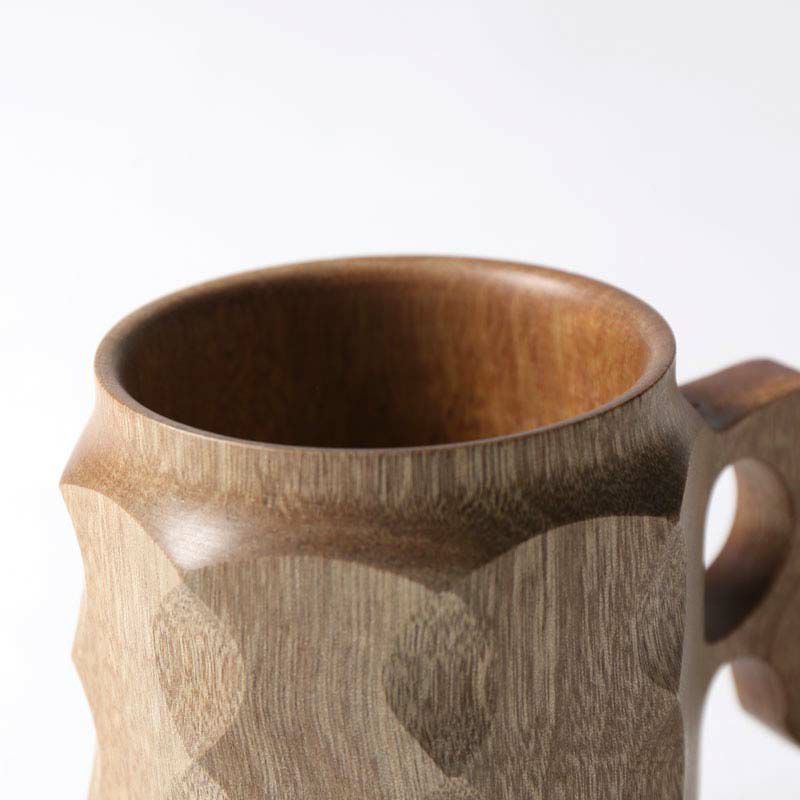 思わず触りたくなる独特の手彫りの外観。手に馴染みやすい取っ手。カップの縁は薄く丁寧に仕上げられています。長く使い込むほどに味わい深さが増す一品です。