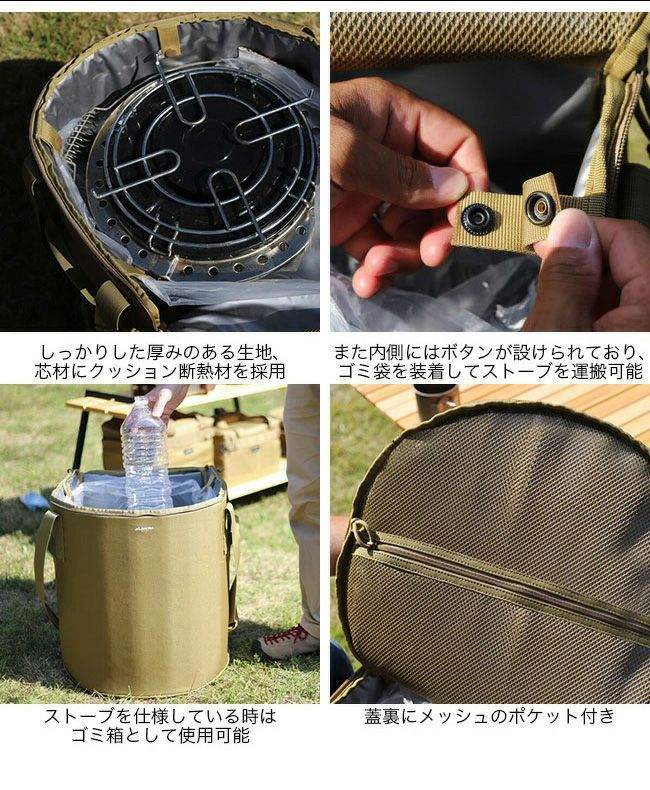 ウッドロールテーブルなどが有名なANOBAから出たストーブケースです。ミリタリー感のあるキャンプで馴染むようなデザインがかっこいいです。サイズもかなり大きいのでフィールドに持っていくようなストーブでしたら大体は入るのではないでしょうか。外側がコーデュラナイロン?のようなしっかりした生地で内側がツヤっとした水を通さないような生地になっています。そしてストーブを出した後はダストボックスになるという優れものです。最近はストーブケースも色々なメーカーから出ていますがこのしっかりした作りとサイズでここまでリーズナブルな物は今のところ無いのではないでしょうか。
