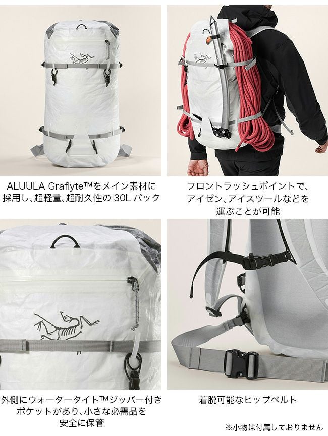 岩、氷、アルパインクライミングに適した超軽量、超耐久性の 30L パック。