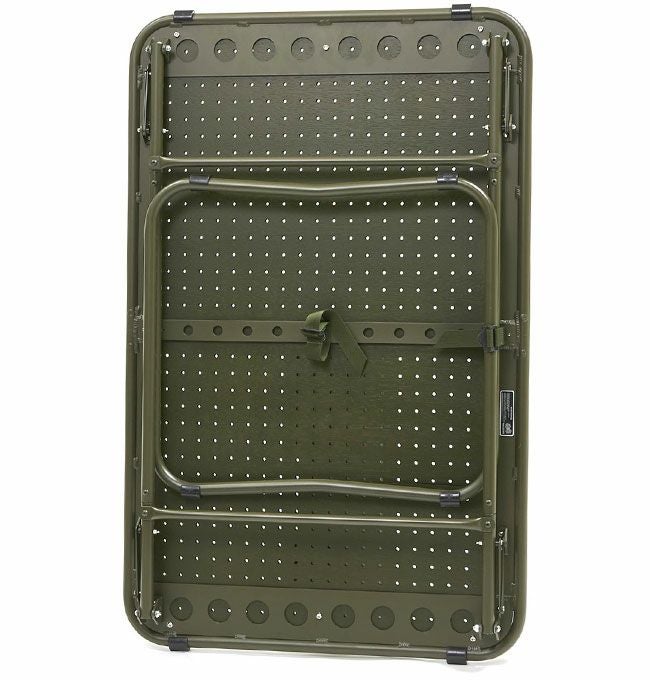 他には天板を「有孔ボード」に統一し以前のラワン材とは一味違った表情となっている点と以前には無かったショートレッグ時に脚をまとめるベルトを裏面中央に追加しています。