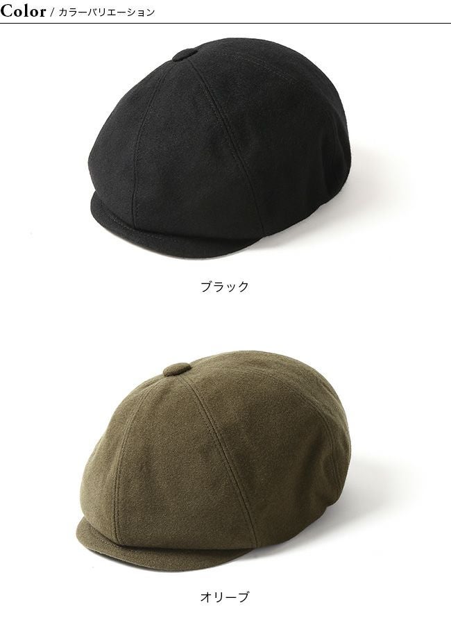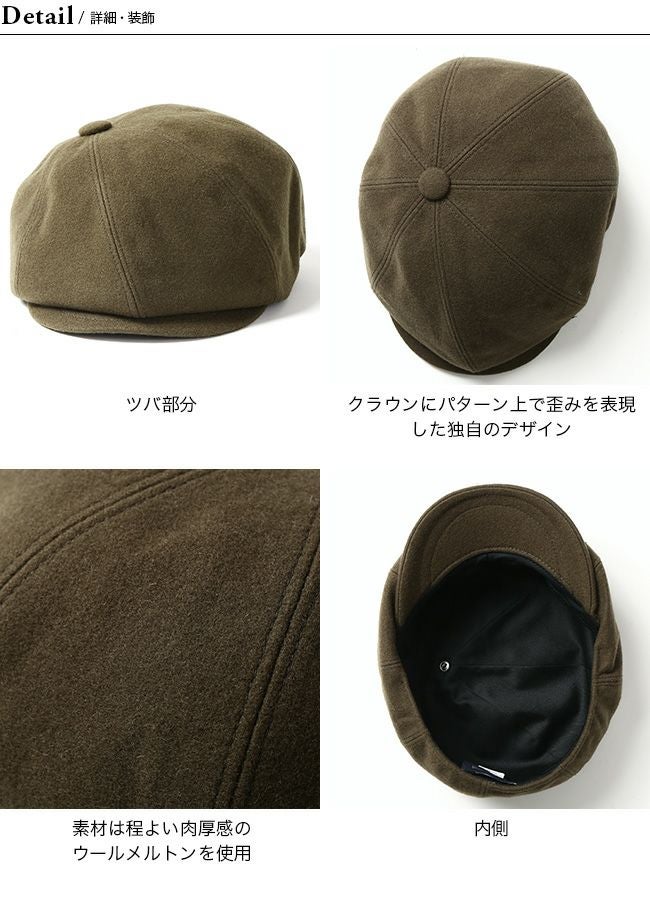 ハンチングキャスケットのクラウンにパターン上で歪みの表現を加える事で、被り易いシルエットでありながら、他には無い独自のデザインとなっています。