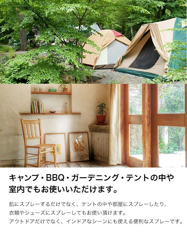 虫よけと同時に気になる汗の臭いも抑え、衣類ファブリック、空間など幅広く使えます。