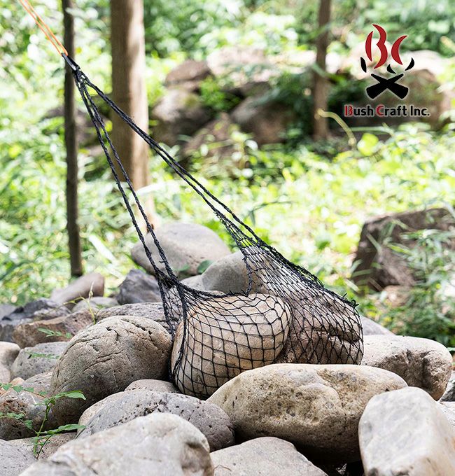 安定した重たい石を包み込み、タープやテントのロープに対し、当製品のカラビナを介して接続してください。