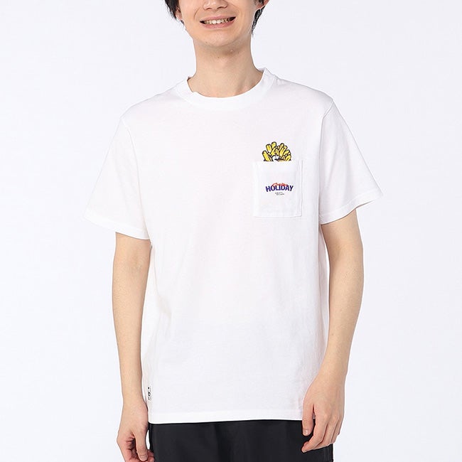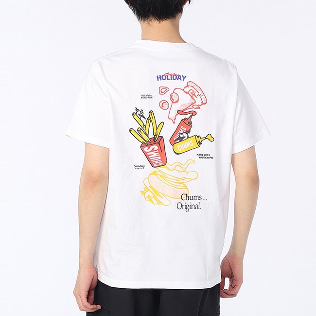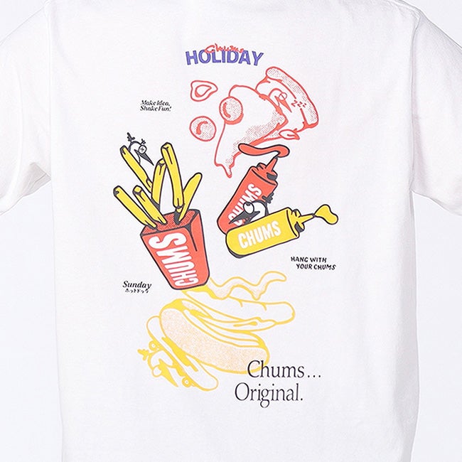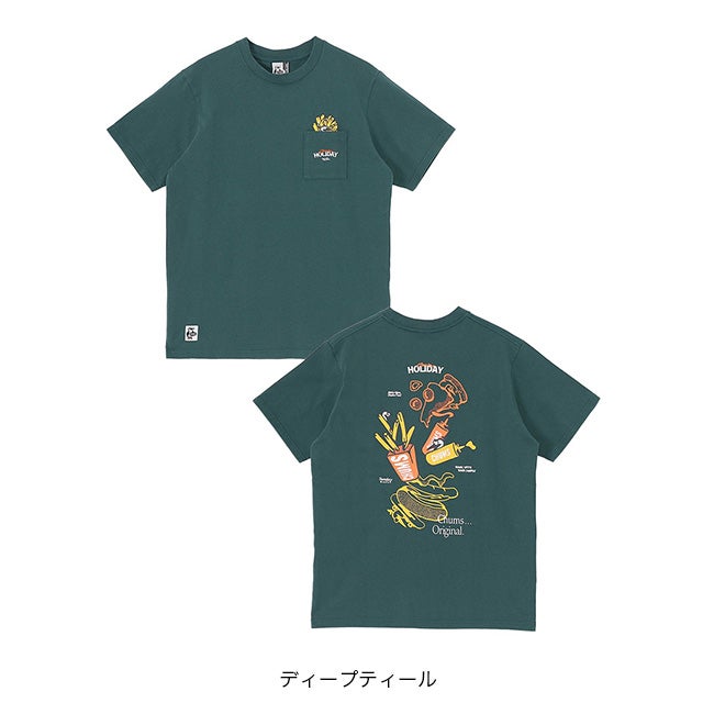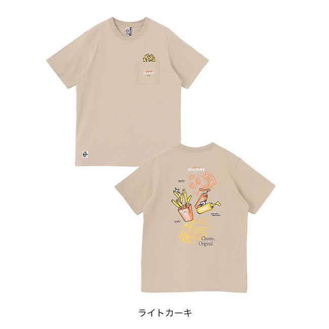 左胸のポケットには、“CHUMS HOLIDAY”の文字とともに、ポテトボックスに紛れたブービーがひょっこり顔をのぞかせるあそびゴコロあふれるデザインを配置しました。