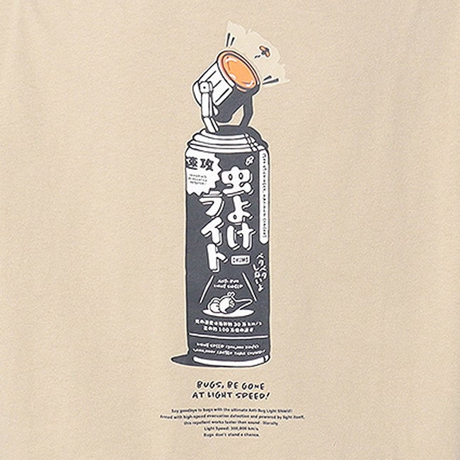 バックプリントには、スプレー缶型の“虫よけライト”とキャッチーな英語コピーを組み合わせ、まるでSF映画の未来広告を思わせるポップなグラフィックに。