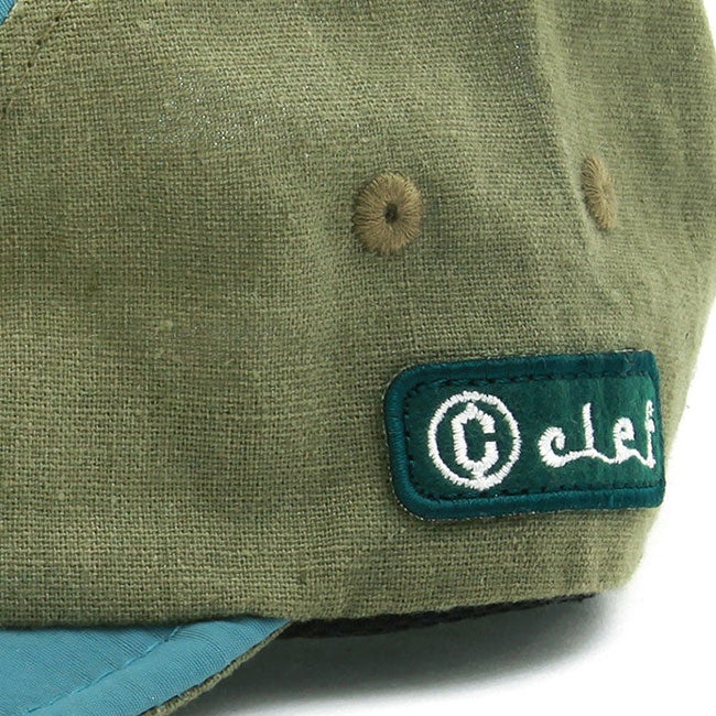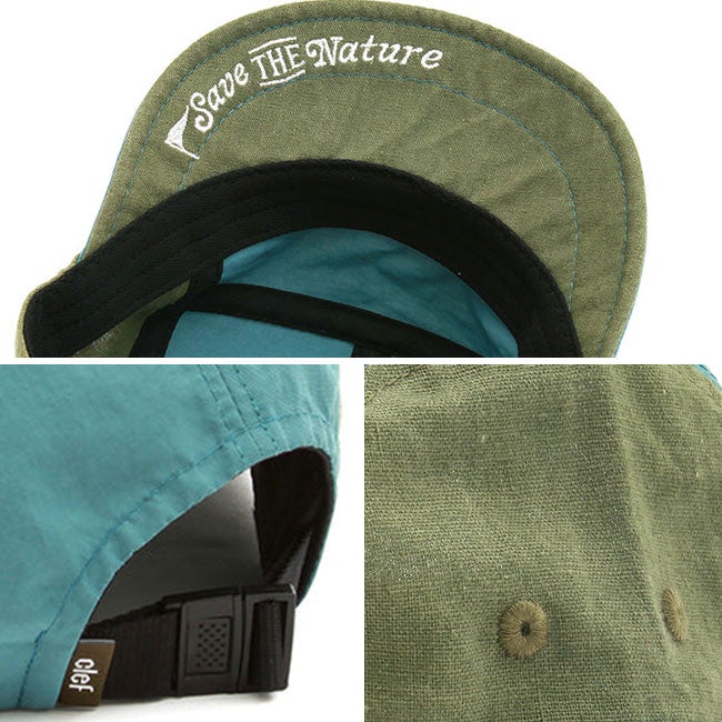 つば裏の「SAVE THE NATURE」の刺繍や、Clefのワッペンがアクセントに。