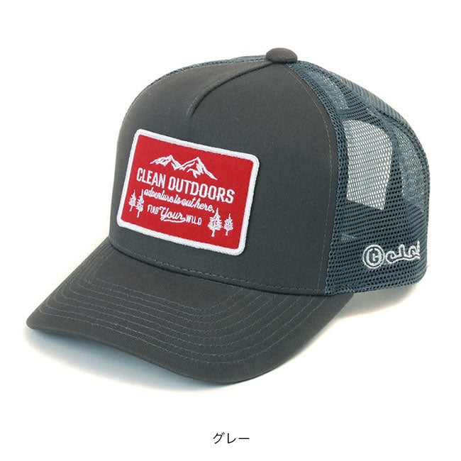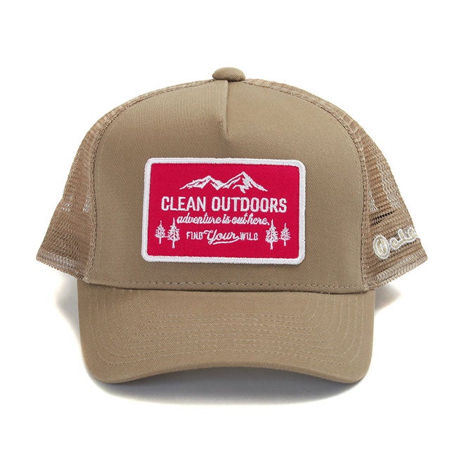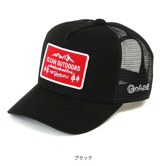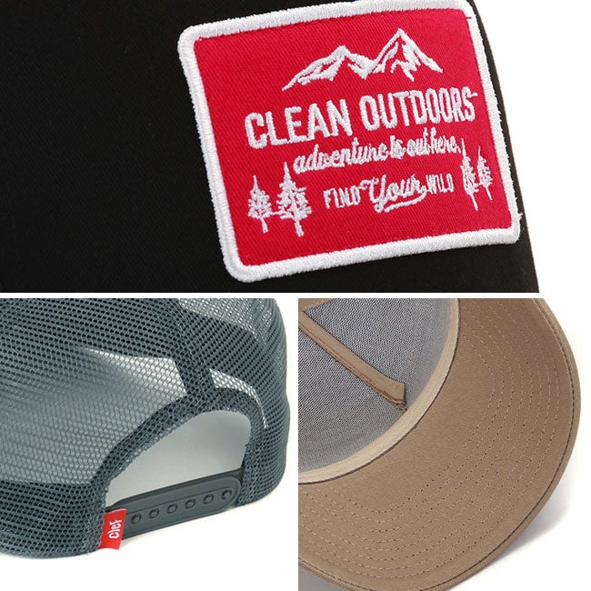 フロントは赤色をベースにしたCLEAN OUTDOORSのワッペンがファッションのアクセントに。