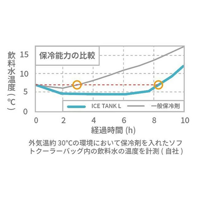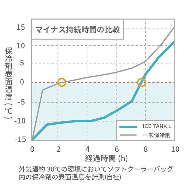一般保冷剤と比較して保冷能力が3倍、マイナス持続時間が4倍です。