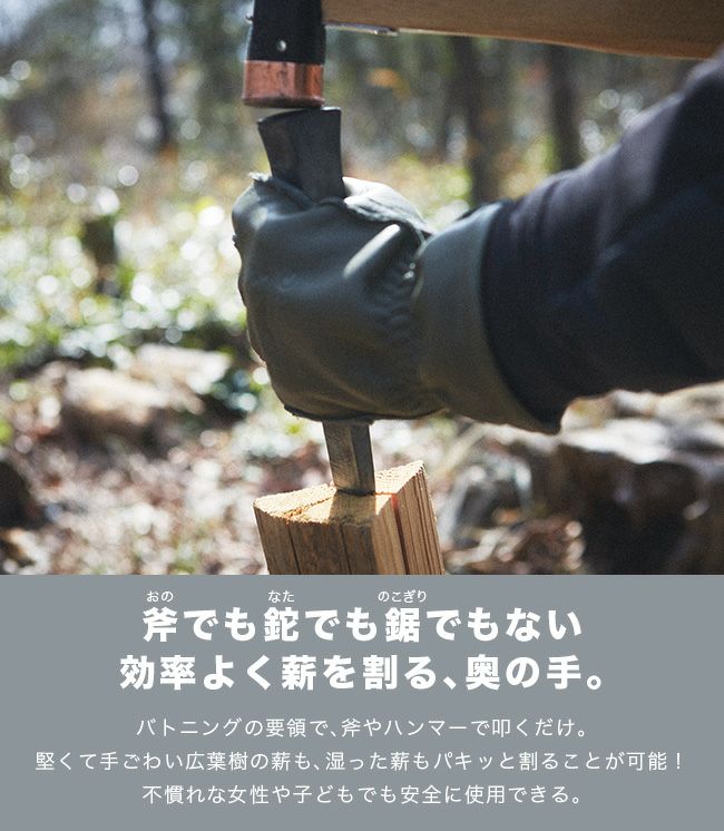 バトニングの要領で斧やハンマーと併用することで、キャンプの時に効率よく薪割りができます。