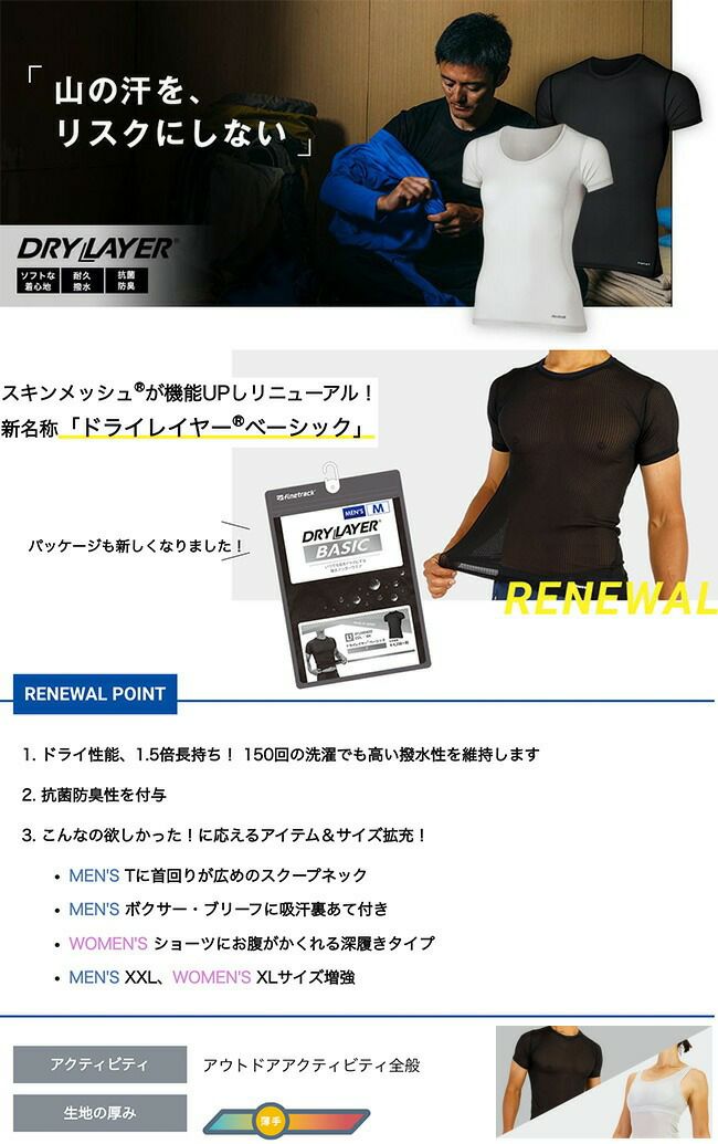 吸汗速乾ウエアの下に着て、汗冷えや汗のベタつきを軽減するための肌着・ドライレイヤー®の定番シリーズです。