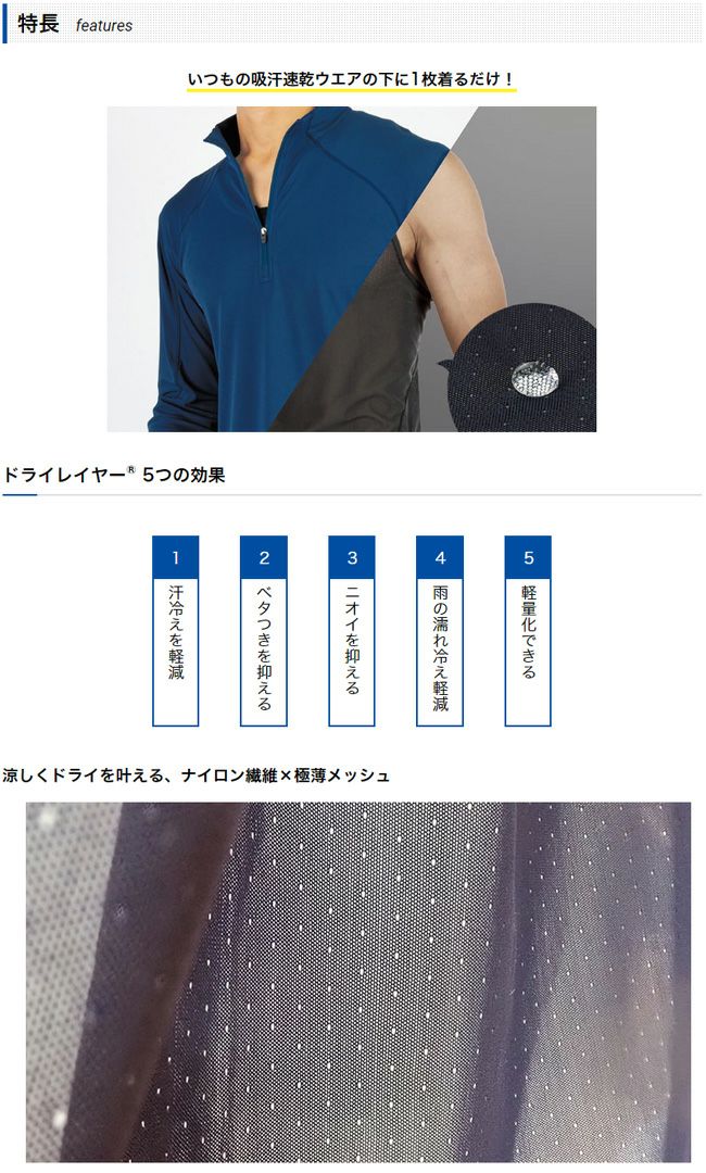 ※ドライレイヤー®は吸汗速乾ウエアとの重ね着で効果を発揮します。肌に直接ご着用いただき、その上に吸汗速乾ウエアをレイヤリングしてください。