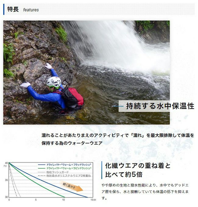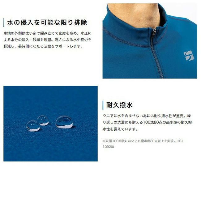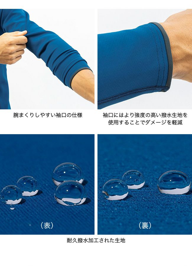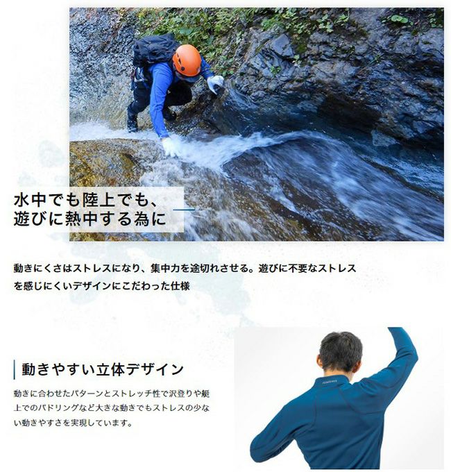 また、ドライレイヤー®やアウターシェルとレイヤリングすることで、肌面からの濡れを遠ざけ、水圧による水の浸入を軽減するなど、水中も陸上もより快適な行動が可能です。