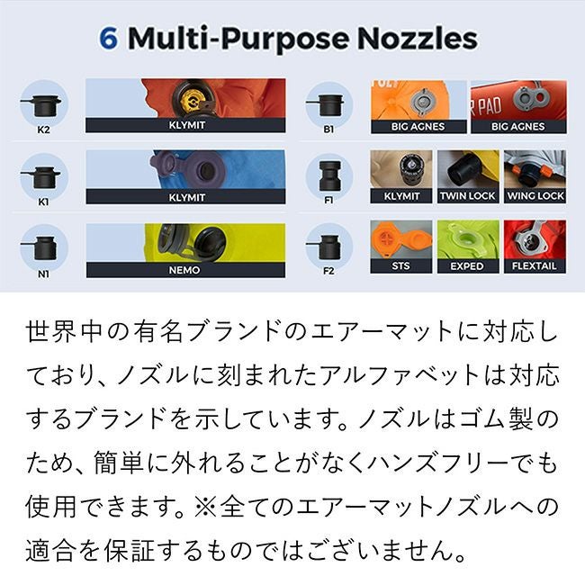 付属ノズルは6種類と豊富で様々なブランドのエアーマットに対応。