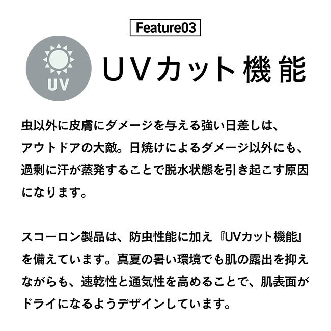 とまっても、刺されにくく、逃げていく画期的な防虫性能。『スコーロン®』は、アース製薬の開発した防虫剤を、帝人グループのナノレベルの接着技術により生地に固定した防虫繊維。従来の防虫素材の弱点であった洗濯耐久性が飛躍的に向上し、洗濯を30回繰り返しても防虫機能を維持できます。蚊やマダニにのいる野外や、日焼けが気になるさまざまなシチュエーションでの着用が可能です。(注:スコーロン®は、帝人フロンティア株式会社の防虫加工素材の登録商標です。)