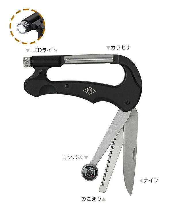 のこぎり、ナイフ、LEDライト、カラビナ、コンパスが付属された、5 in 1マルチツールです。