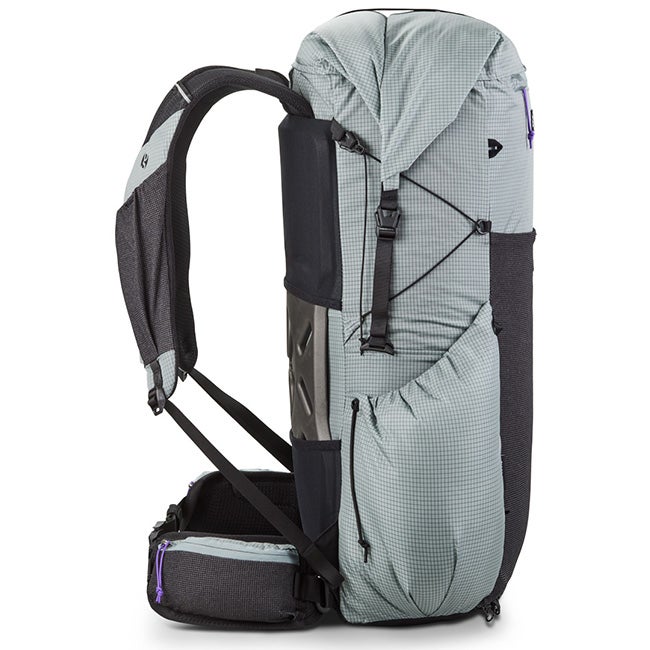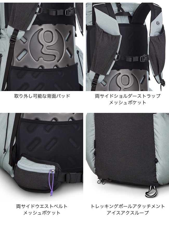 メッシュポケット、ショルダーストラップポケット、ファストベルトポケット部分にはUHMWPE(超高分子量ポリエチレン)Stretch Meshを使用。