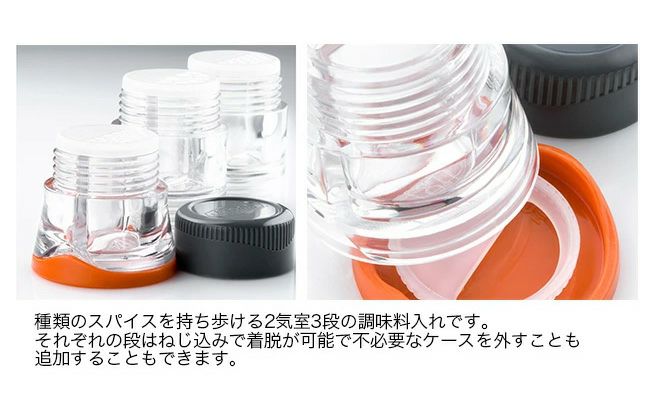 6種類のスパイスを持ち歩ける2気室3段の調味料入れです。