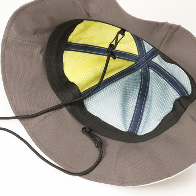 裏地にはメッシュ生地を使用し、着脱可能なアゴ紐を取り付け機能面を考慮しています。