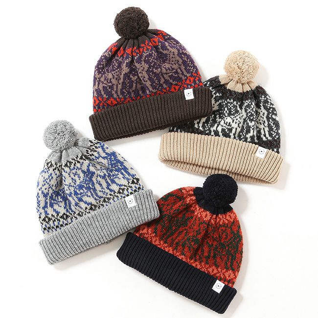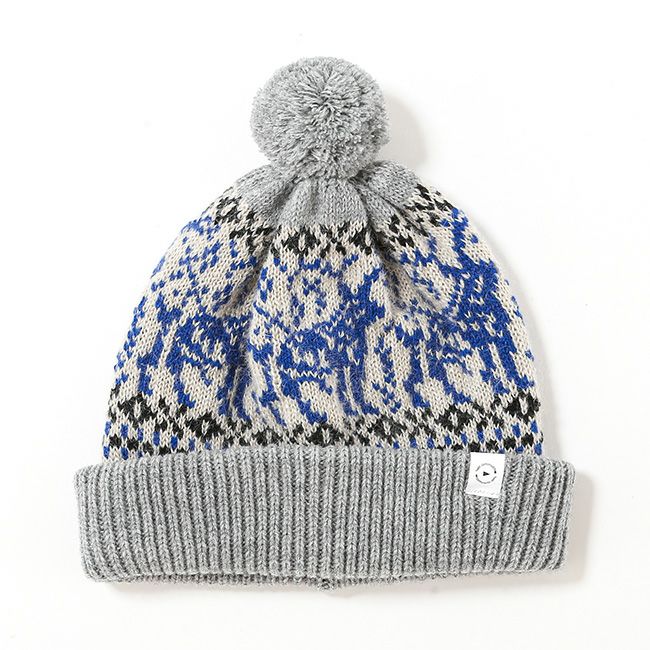 クラシカルな柄が特徴のボンボン付きニット帽。