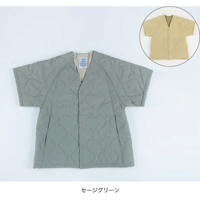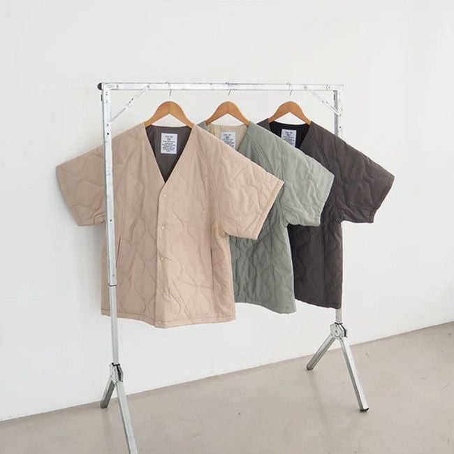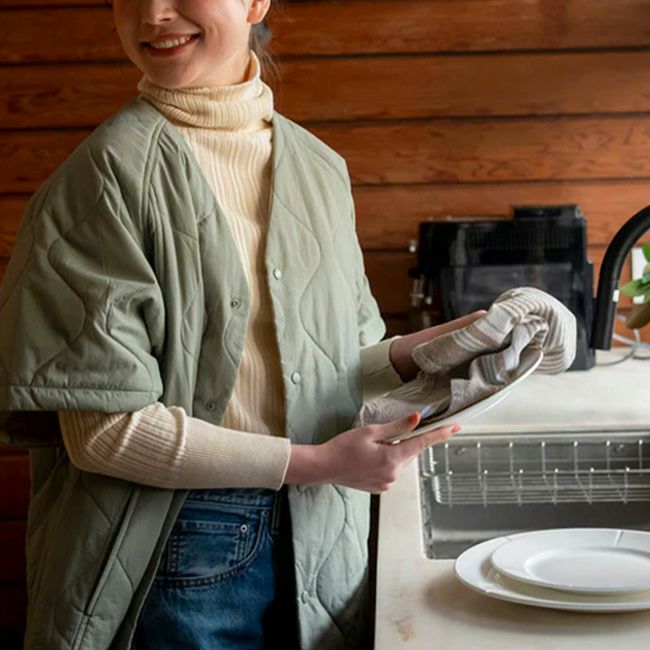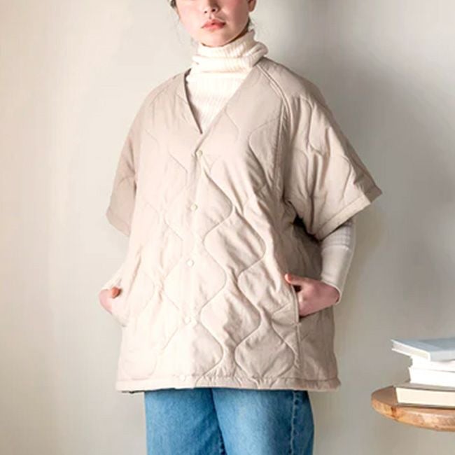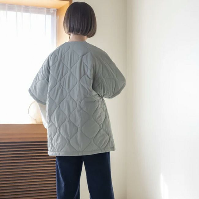 軽い着心地と、小さく畳めるパッカブル仕様が特徴のはんてん型の羽織り【COM-FLY/ コンフリー】の作業や家事がしやすいハーフスリーブタイプ。