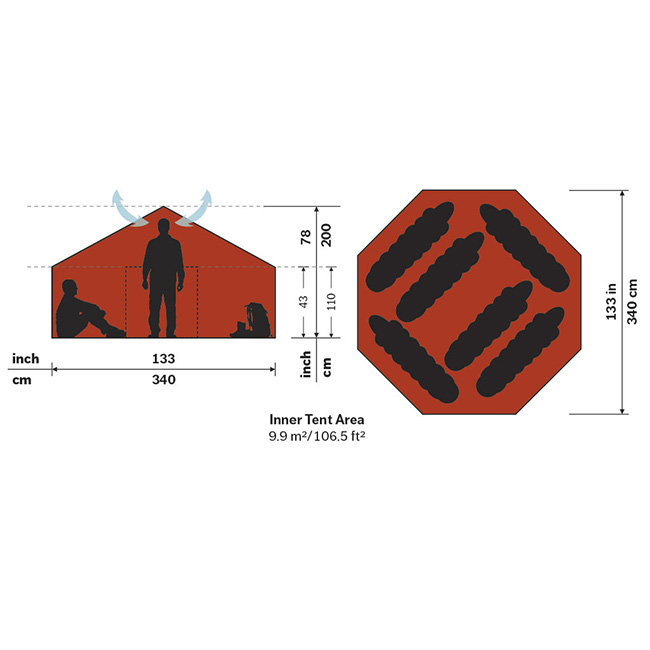 センターポールとサイドに8本のポールで設営可能なため、デットスペースのない作りとなっています。