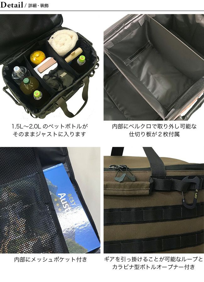 Mサイズは非常に使い易いサイズ 1.5L∼2Lのペットボトルがそのままジャストに入れられ,両サイドには重たい荷物を二人で運べる持ち手付き、上蓋内側に汎用性の高いメッシュポケットが付いています。