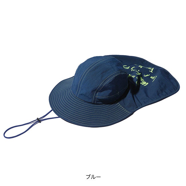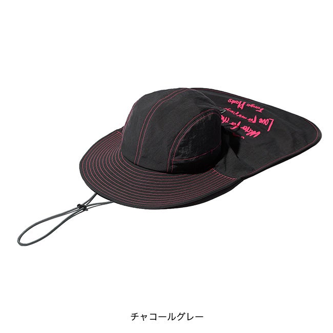首や頬までしっかりカバーする広めの設計に加え、風で飛ばされにくいストラップ付きで安心感のある着用感。