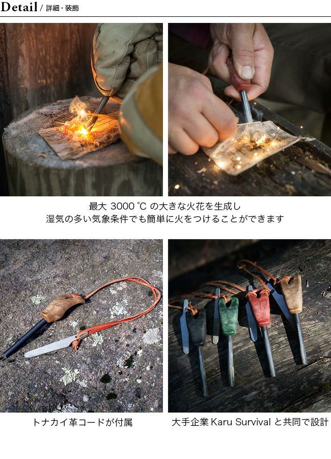 コンパクトなストライカーとトナカイレザーコードが付属しており、安全なハンドルは手袋を着用した状態でも使用できます。