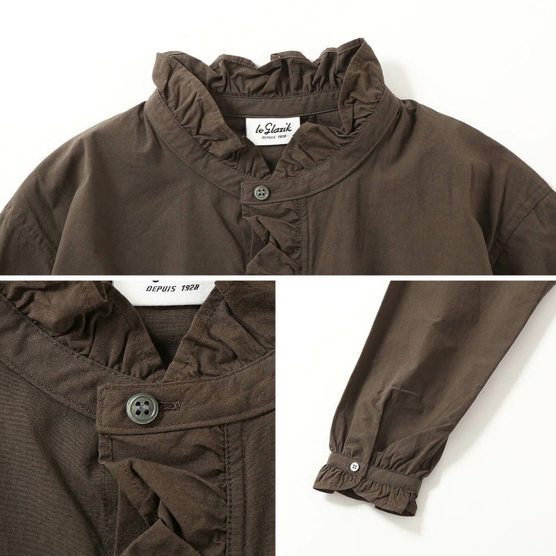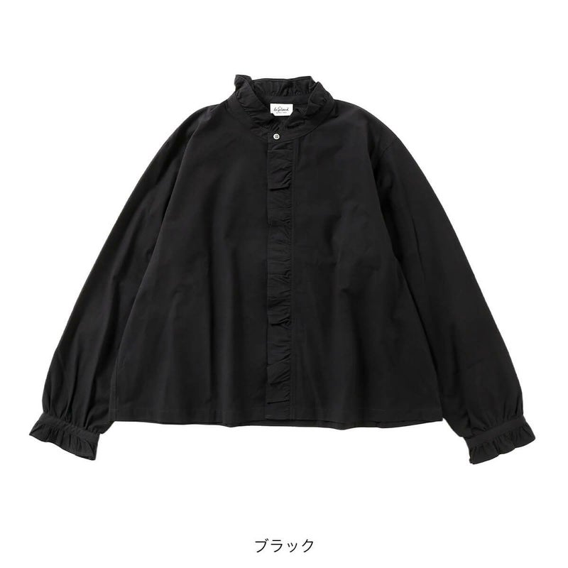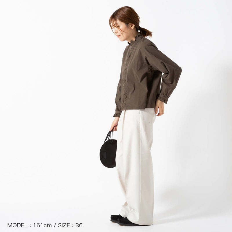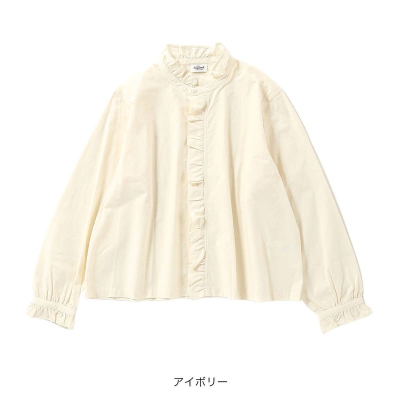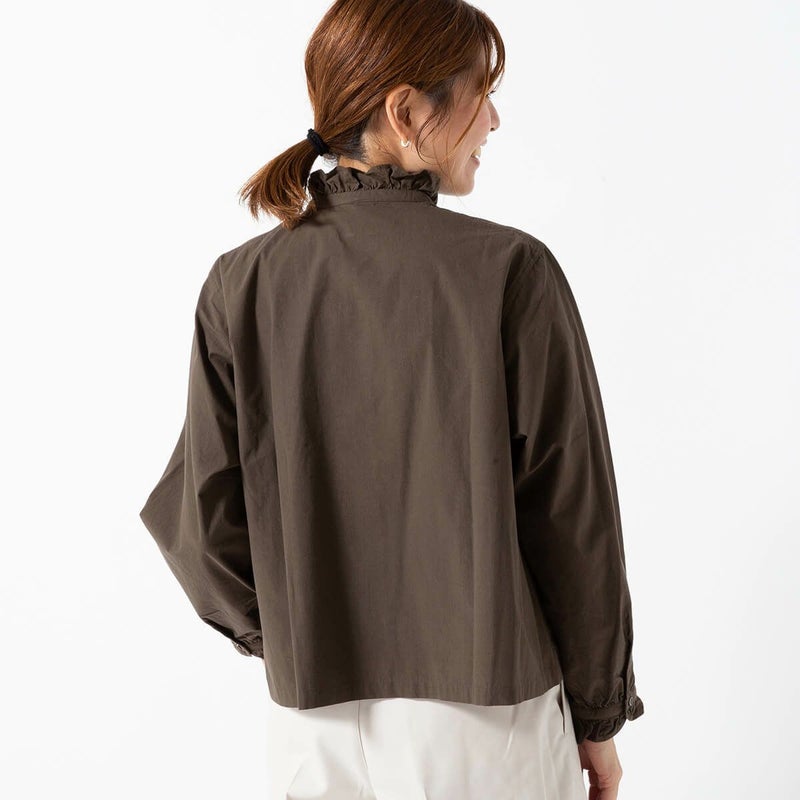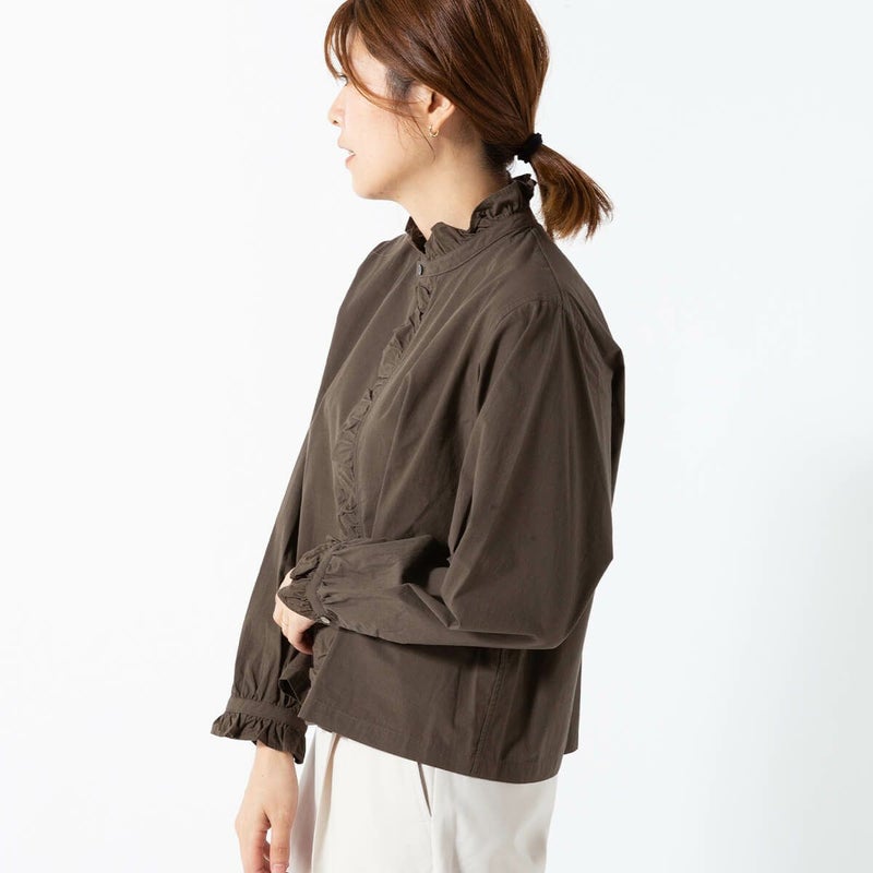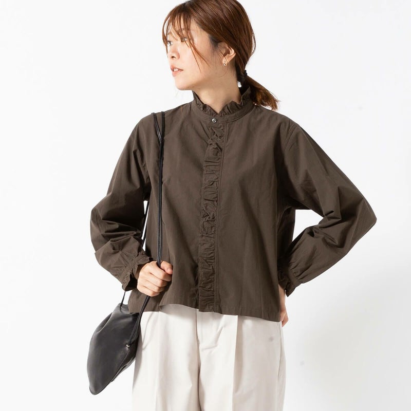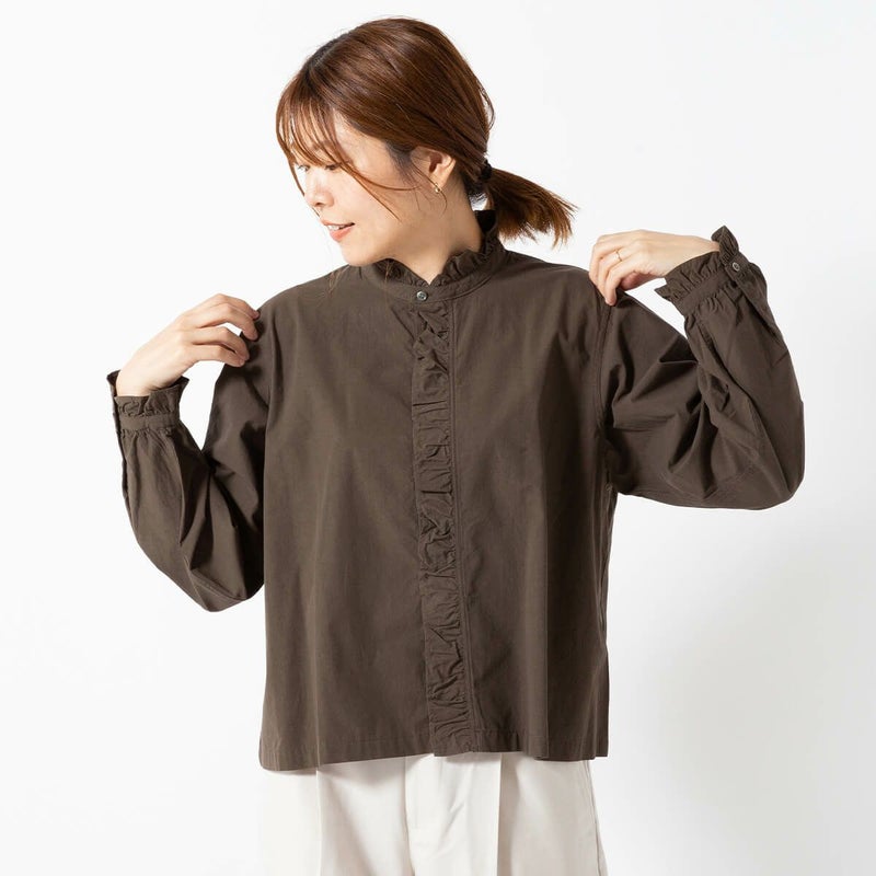 衿と前立てのフリルがポイントの一枚で華やかな印象になるブラウス。