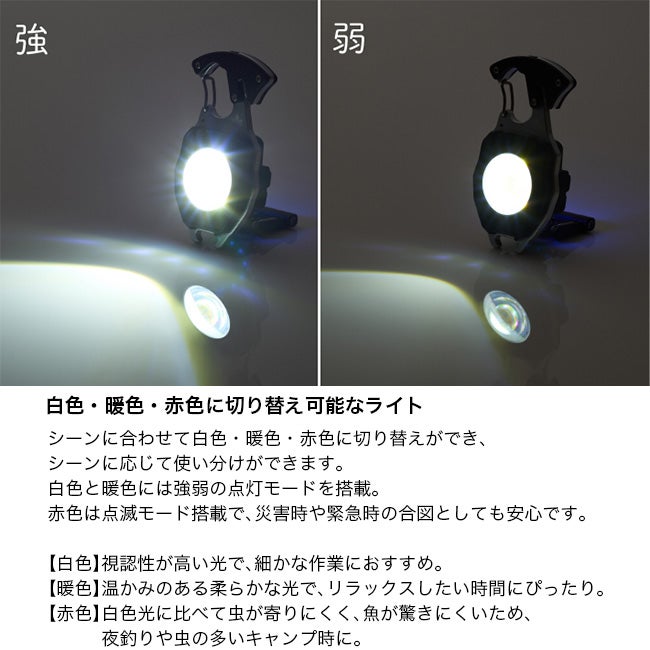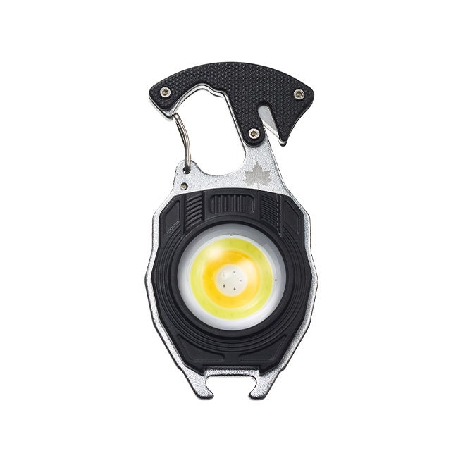 ・ライト、火おこし、ドライバー、シートベルトカッター、栓抜き、ホイッスルの6つの機能が1つに