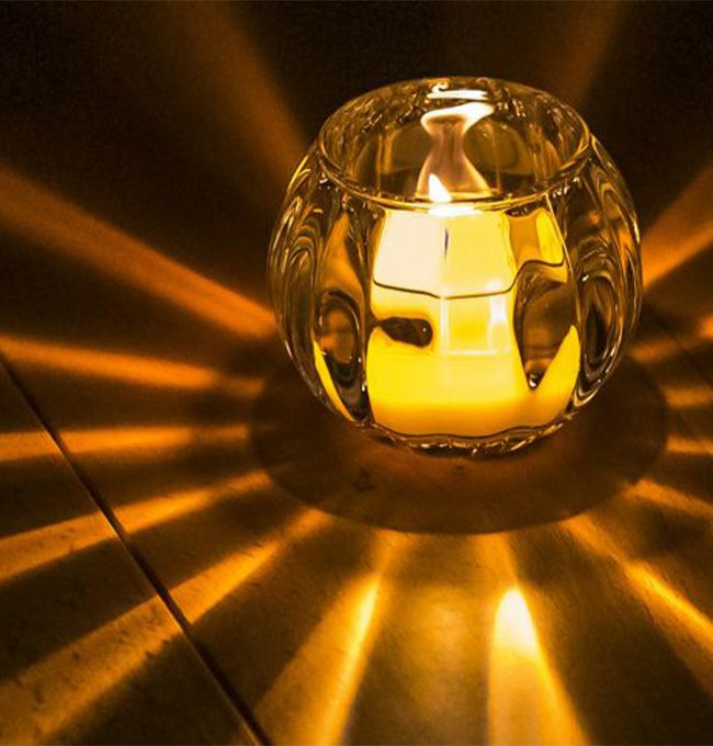 あかりを灯すと、ぽってりと丸い球体から伸びやかで美しい放射状の光が放たれ、炎のゆらめきに合わせて光の筋も左右になびきます。