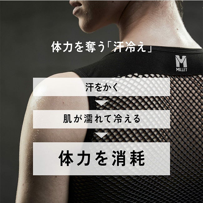・汗はメッシュを抜けて素早くベースレイヤーに移行し、肌をドライな状態に維持するため、