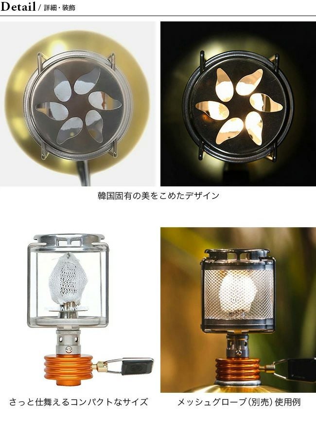 小さなボディーから放つ灯火は、辺りを明るくさせ、ガスランタン特有の音とマントルを通してアナログの感性を演出します 。