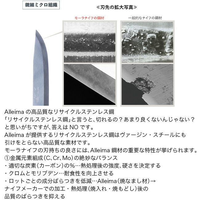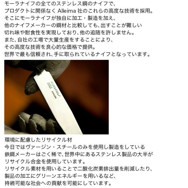 近年では、ステンレス製品のほとんどがリサイクル合金を使用し、モーラナイフの鋼も80%以上がリサイクルされたスウェーデン鋼からなる合金で作られています。