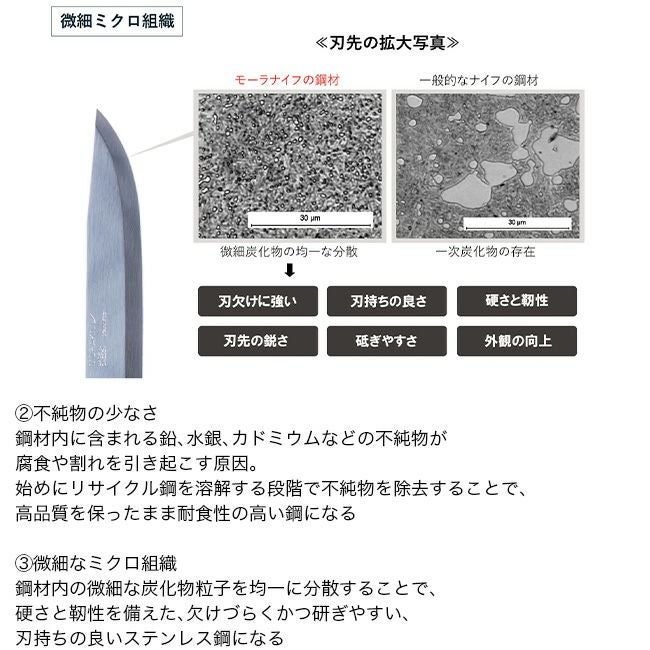 そのステンレス鋼材を、モーラナイフ自社工場でこだわりの製法で製造し十分な耐久性を持った鋼材を生み出しています。