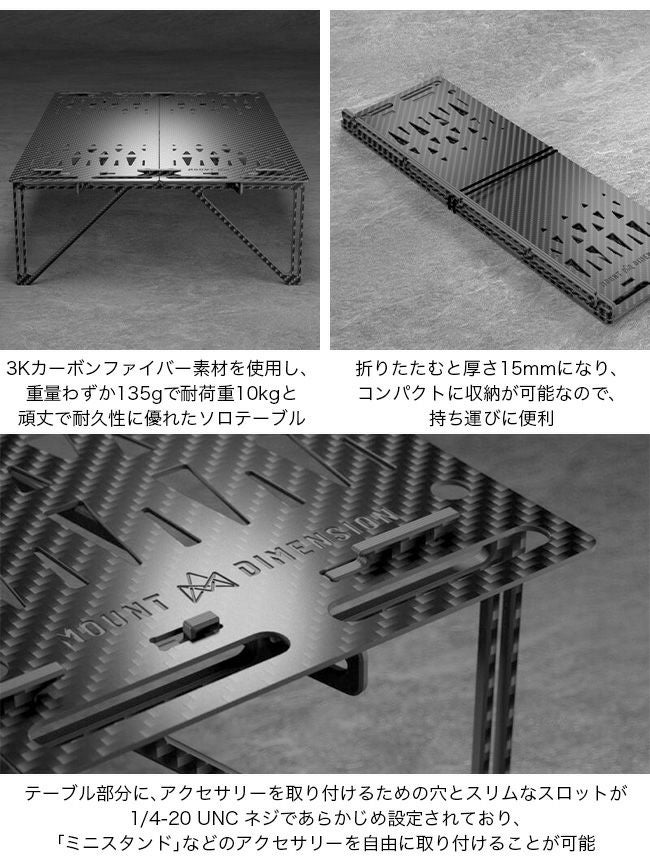 組み立てが簡単で、シンプルで洗練されたデザインと機能性を併せ持った、3Kカーボンファイバー素材の超軽量ソロテーブルです。