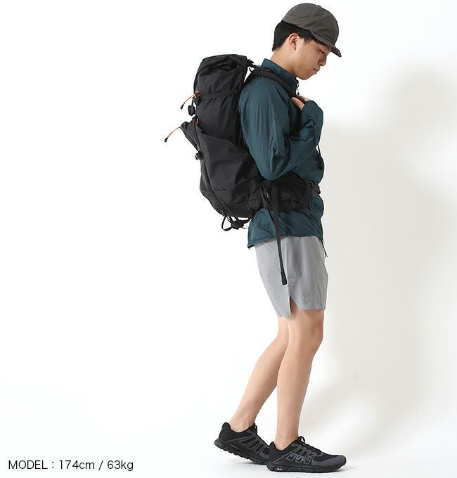 ・圧縮しやすいフロントとサイドのポケットには、薄手のレイヤリングや水筒、出し入れの頻度の高いアイテムの収納に最適