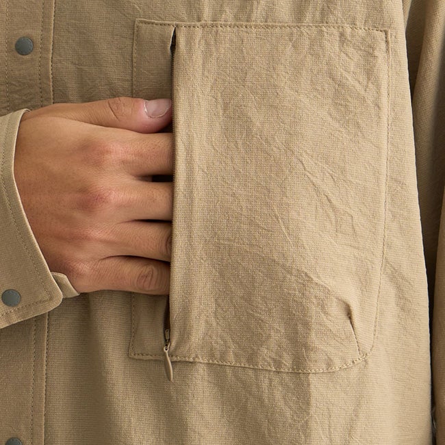両サイドにはシームポケット、胸にはマチ付きポケットを配置し、見た目のミニマルさを保ちながら、実用性も兼ね備えています。