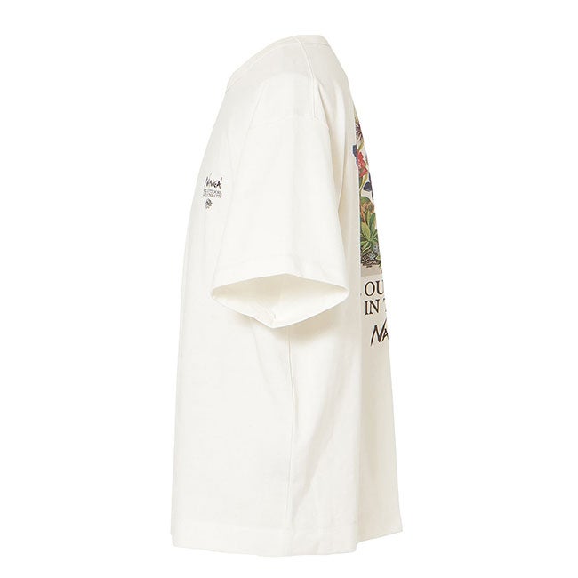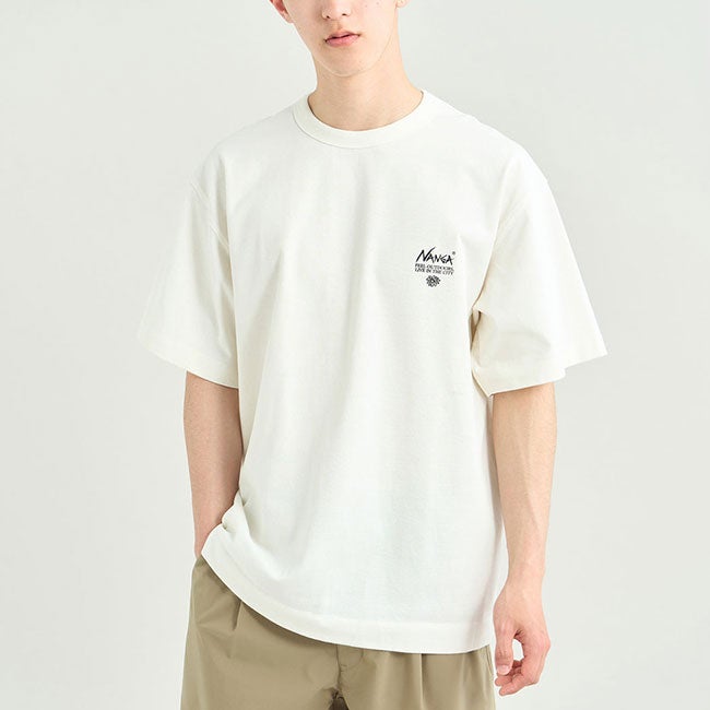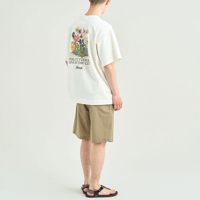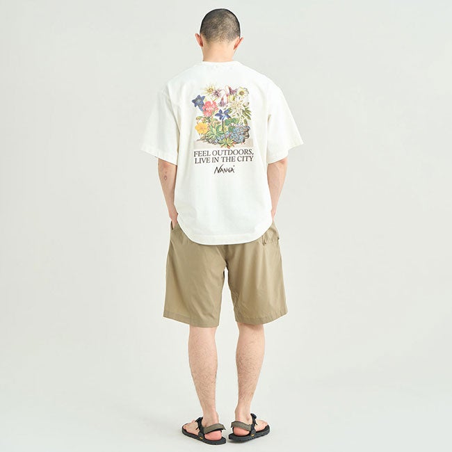 高山植物をヴィンテージ調に描いたオリジナルグラフィックをバックにプリントし、“アウトドアを都市で楽しむ”という今季のテーマを表現したTシャツ。