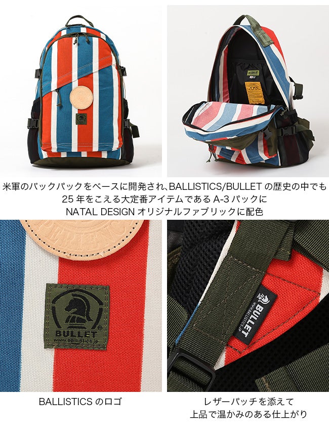 米軍のバックパックをベースに開発され、BALLISTICS/BULLETの歴史の中でも25年をこえる大定番アイテムであるA-3パックにNATAL DESIGNオリジナルファブリックに配色、レザーのワッペンで上品に仕上げていただきました。