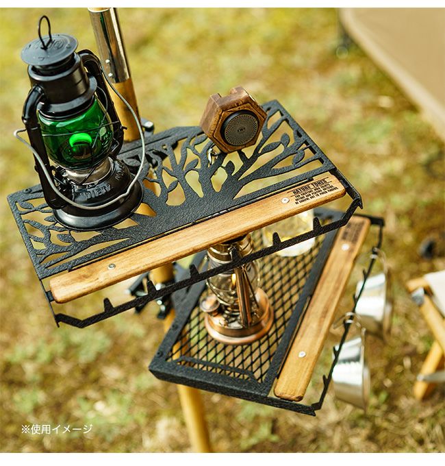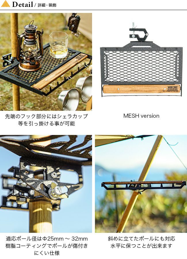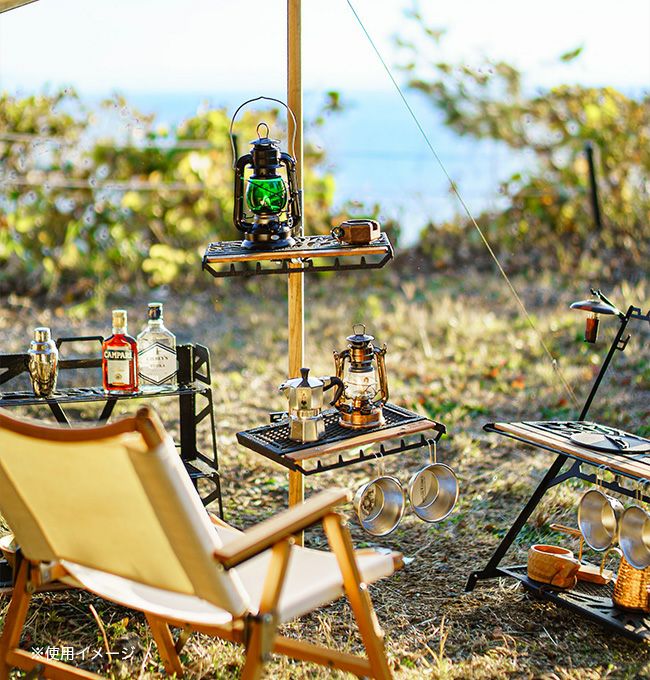 ポールグリップ部分でワンポールテントやタープのポールに挟んで固定し、ちょっとしたアイテムの置き場所やチェアのサイドテーブルとして使うためのテーブルです。