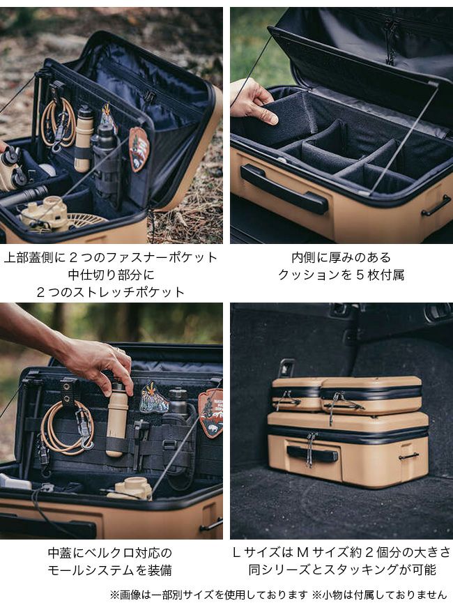 同シリーズのケースとスタッキングが可能で、LサイズにはMサイズを2つ並べて積載可能。