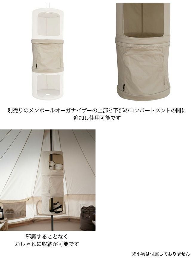 メンポールオーガナイザーにジッパーで簡単に取り付けられ、センターポール周りのスペースを最大限に活用できるよう、垂直に積み重ねることができます。