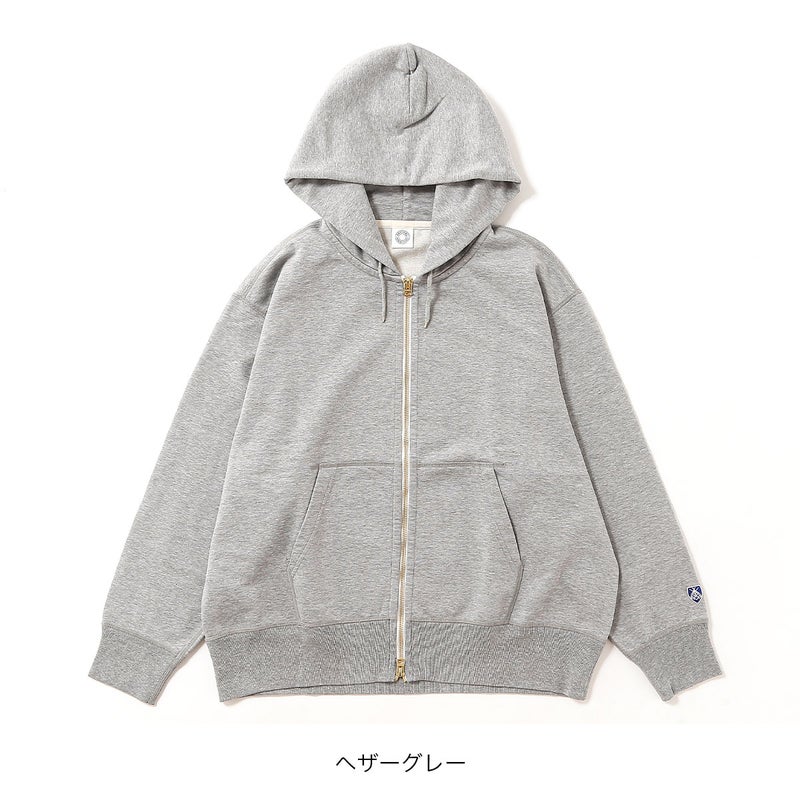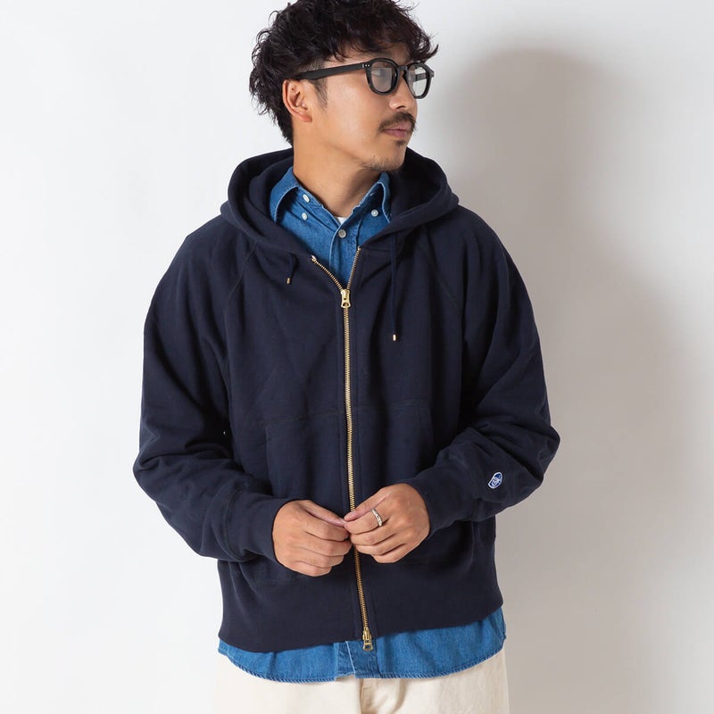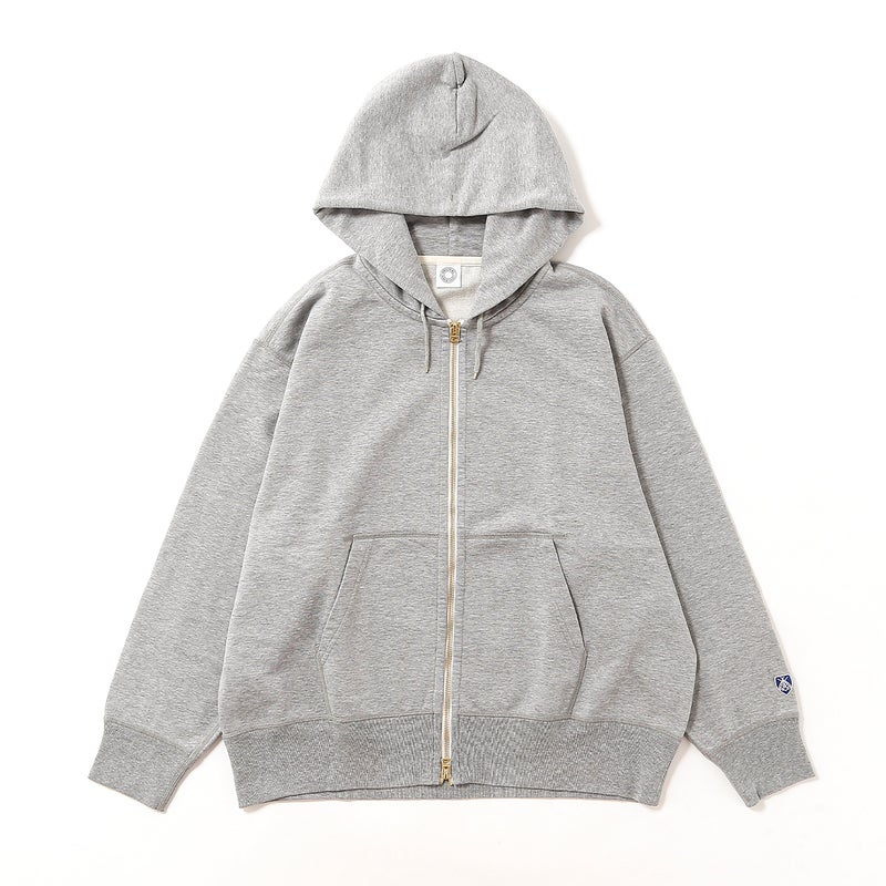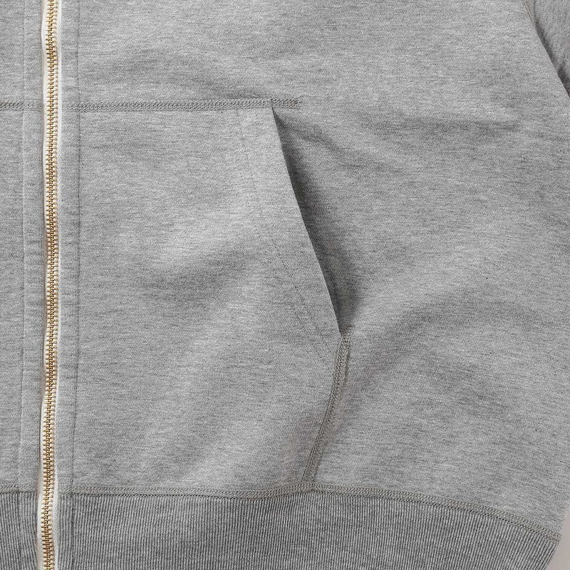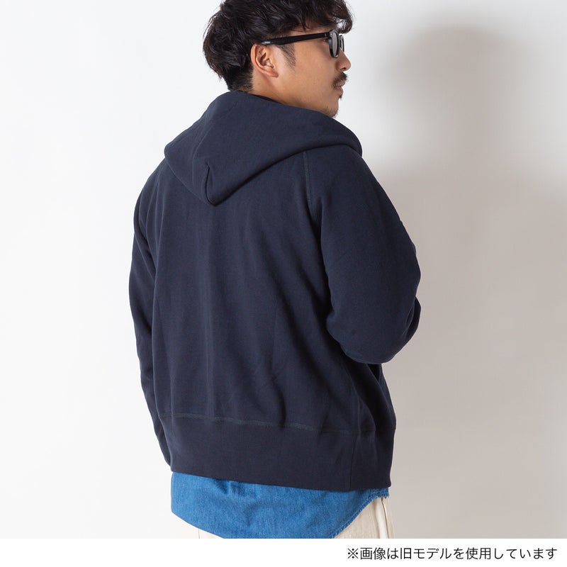 製品洗いを施し、古着のような風合いと絶妙な縮みバランスを表現したセットインスリーブのジップパーカースウェット。