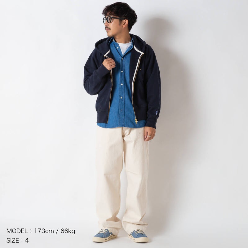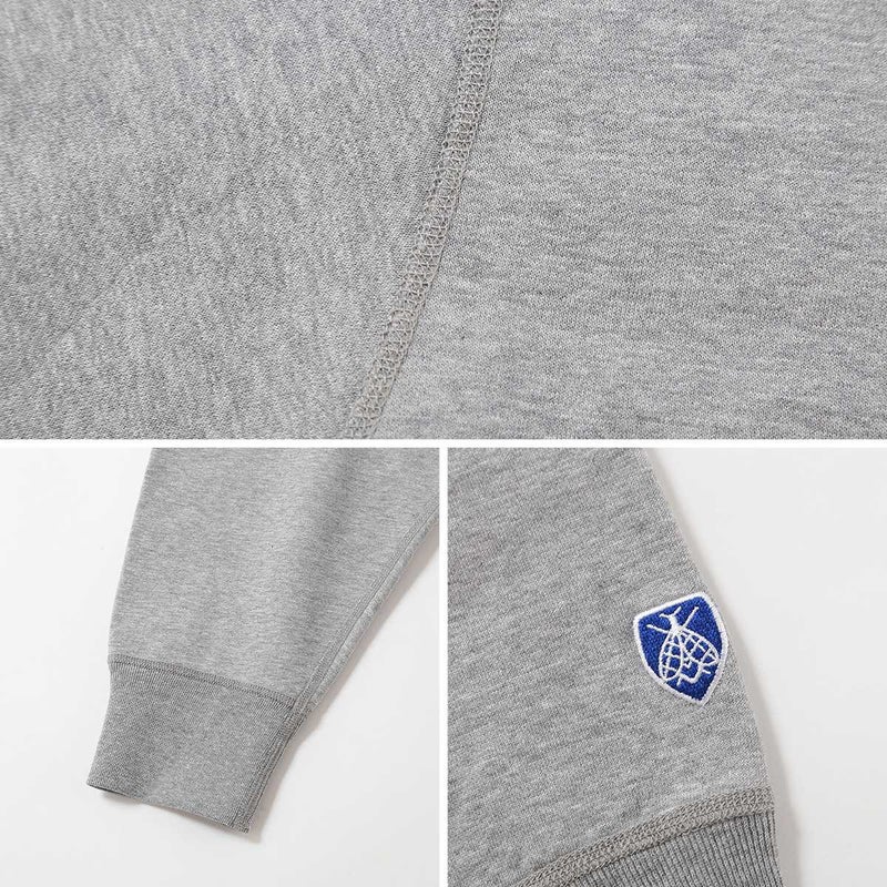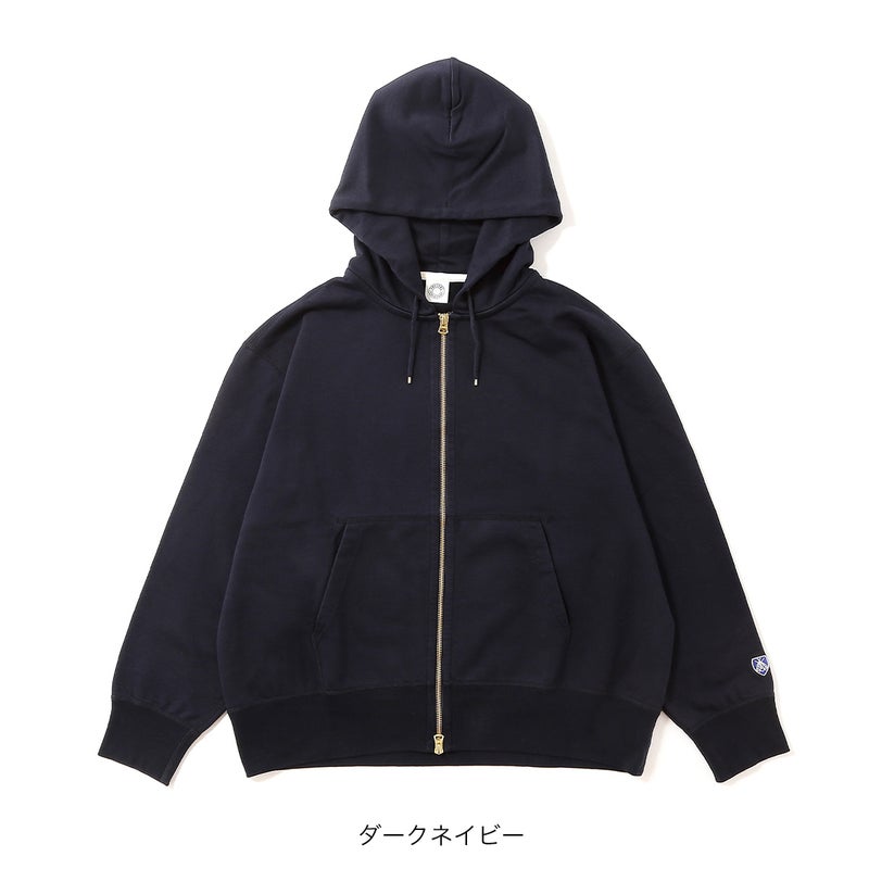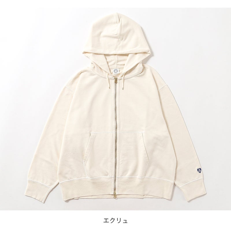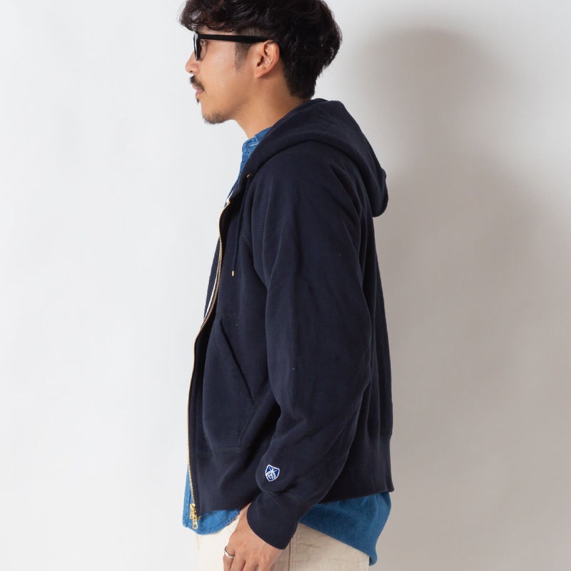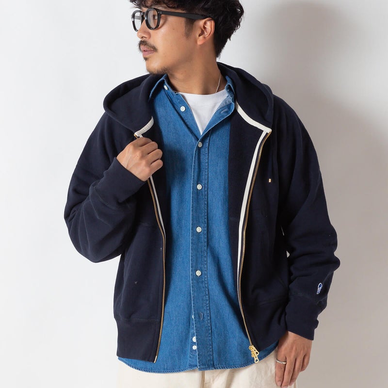 製品洗いを施し、古着のような風合いと絶妙な縮みバランスを表現したセットインスリーブのジップパーカースウェット。