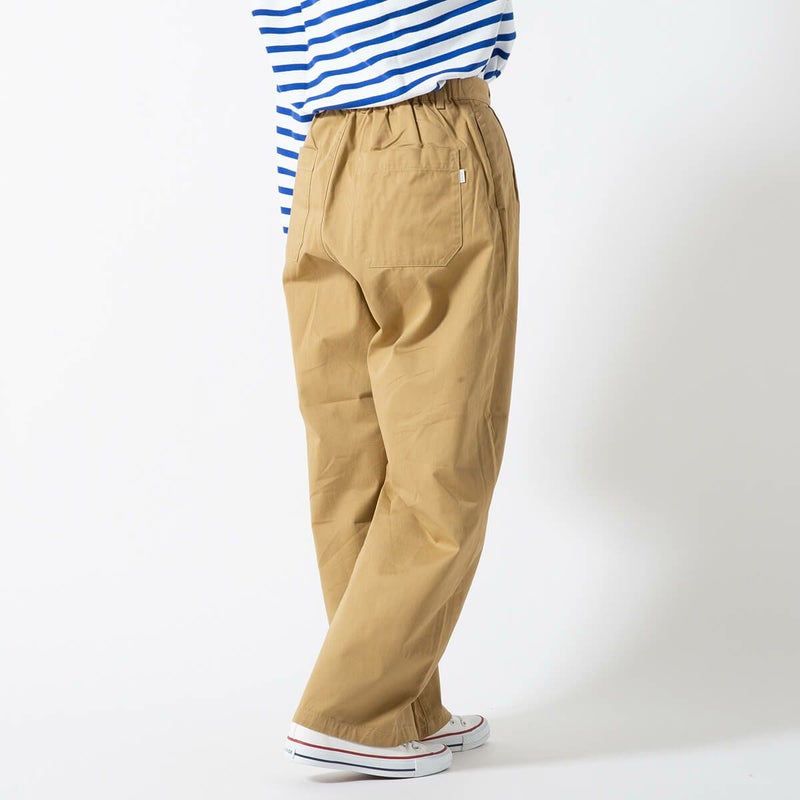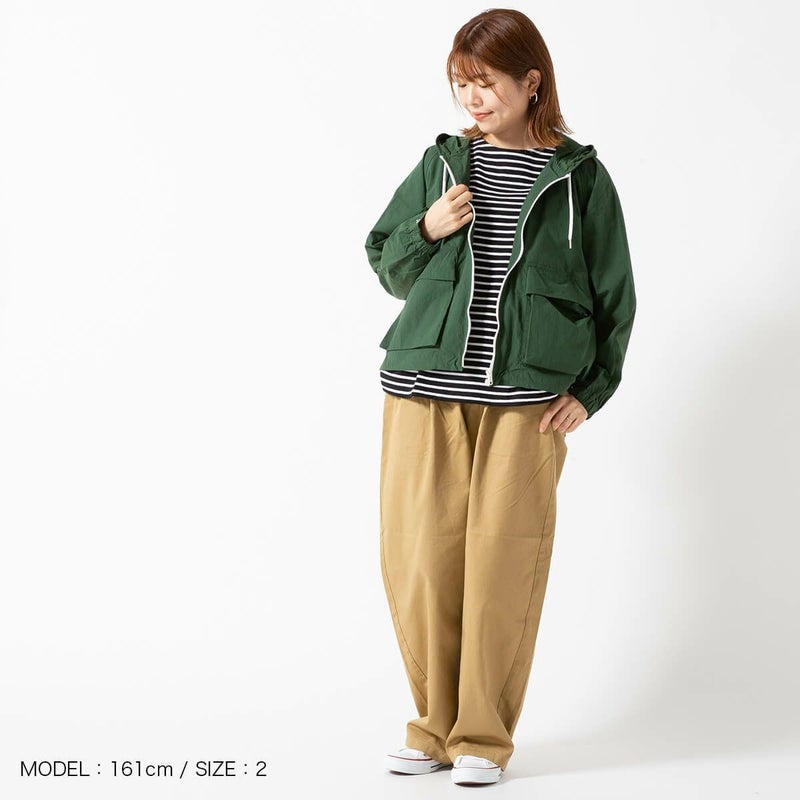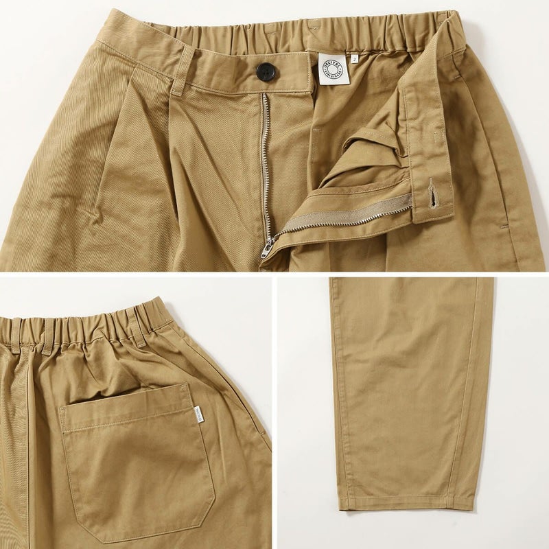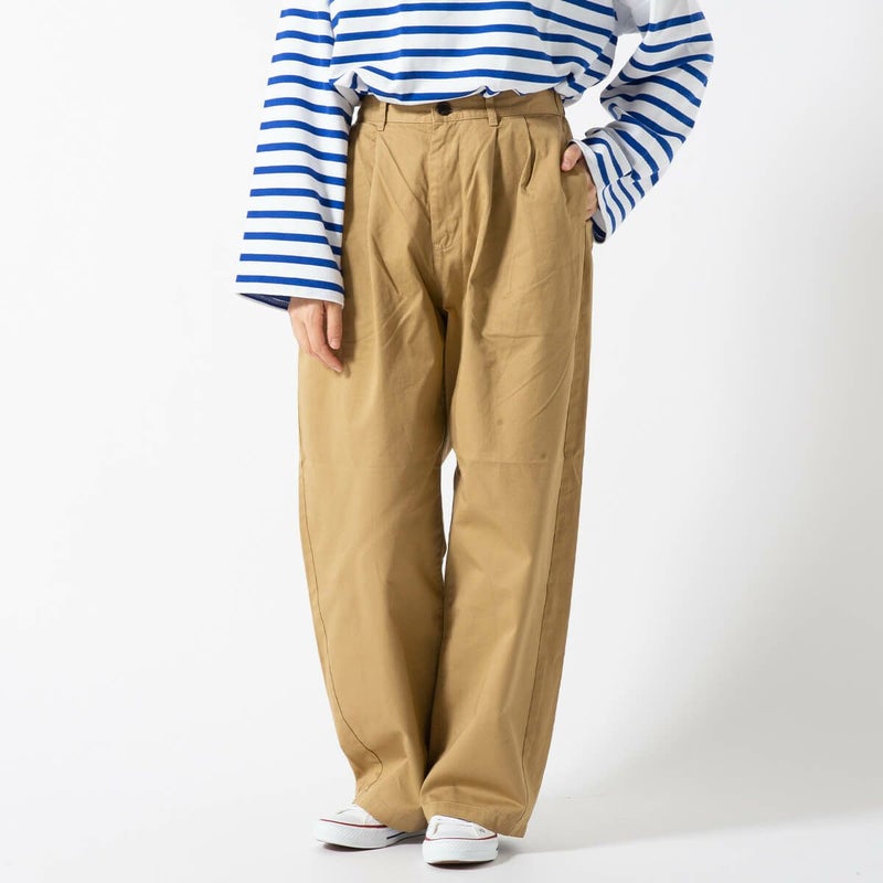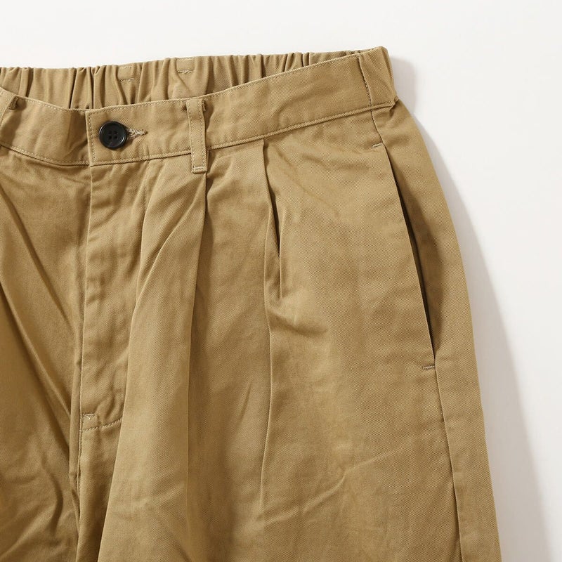 ゆったりとしたサイズ感ですが、後ろベルトのみゴムを入れて、前見頃は2タックのスッキリとしたデザインです。
