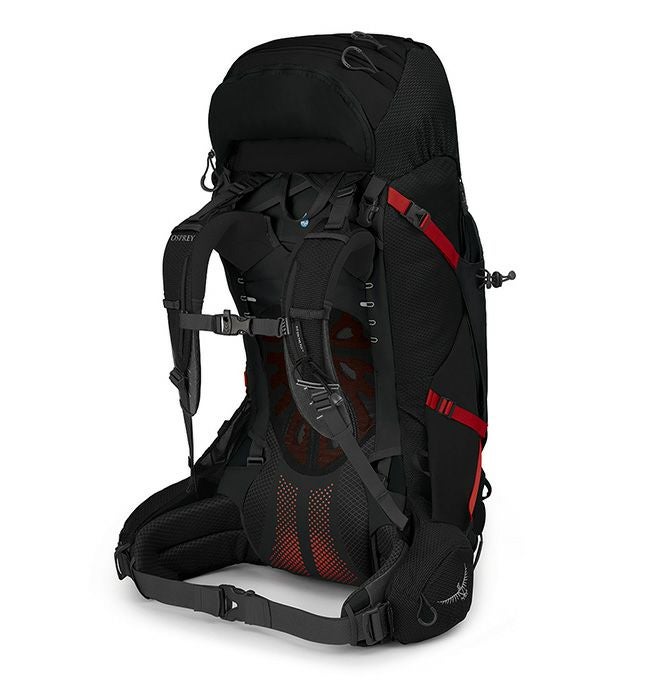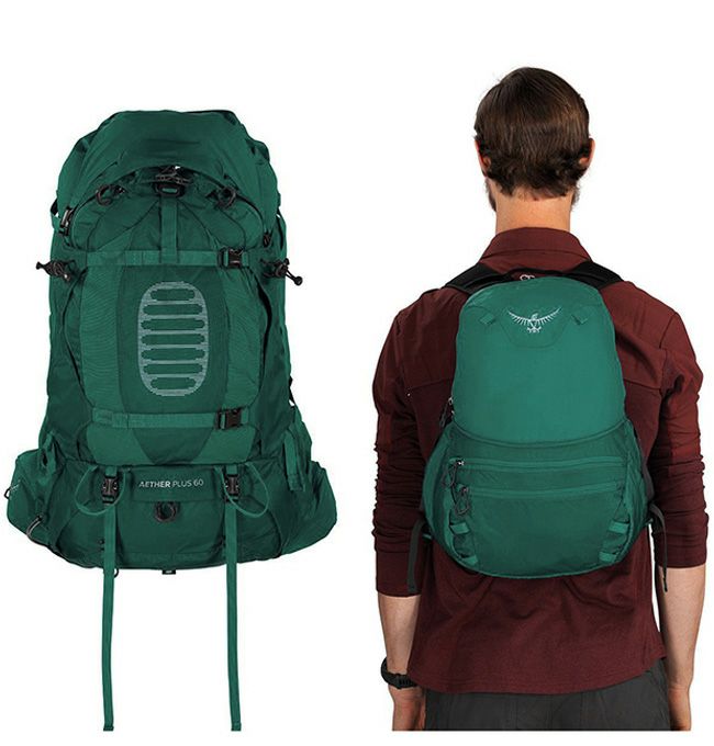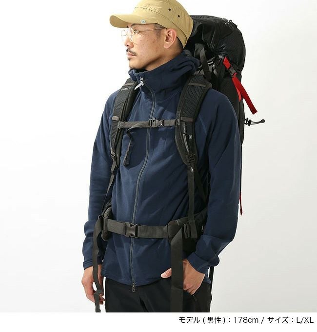 ショルダーハーネスとヒップベルトは長さと角度を細かく調節することが可能で、デイパックになる着脱式のトップリッドとレインカバーを標準装備しています。