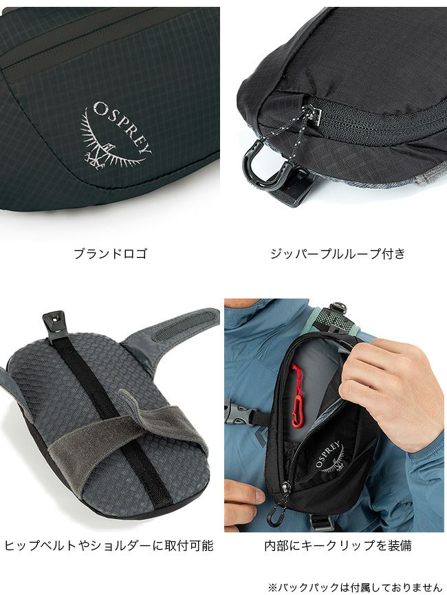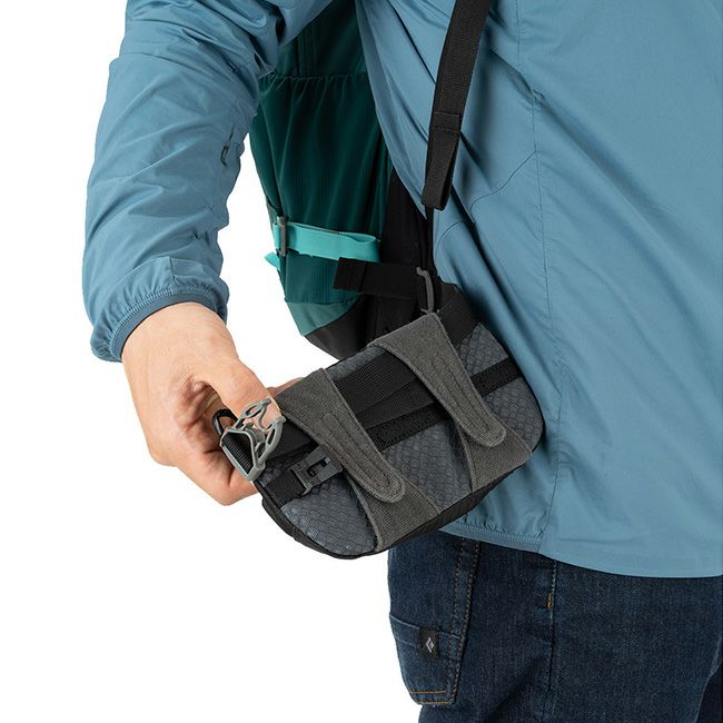 手持ちのバックパックのショルダーハーネスやヒップベルトなどに装着できるポーチ。