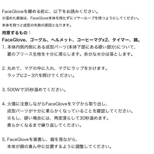 faceGlove® は、POLARTEC ハイロフト素材で作られており、呼吸を妨げることなく顔の最も敏感な部分を保護するためにカスタム成形するプレミアムモデルです。