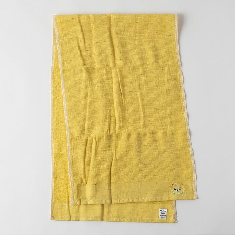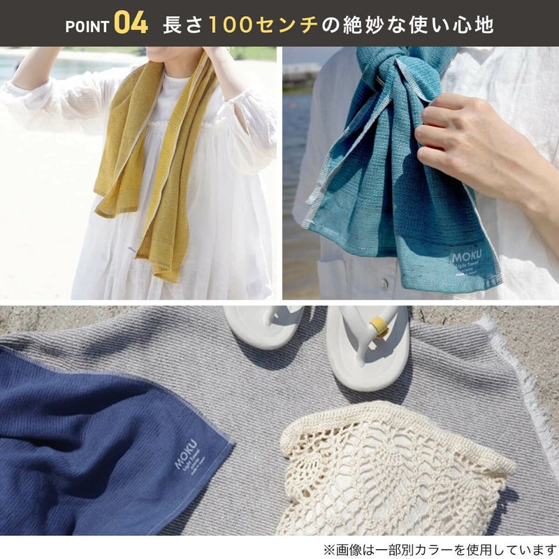 通常のフェイスタオルは大体が80cmほどですが、MOKUは手ぬぐいの長さに近い100cmに設定されています。 この20㎝が思いのほか便利なものです。普通の厚さのタオルが100cmあるとコンパクトさや水ギレの良さが失われてしまいますが、MOKUの薄手な生地感や使用シーンにはこの長さが絶妙に良いといえます。
